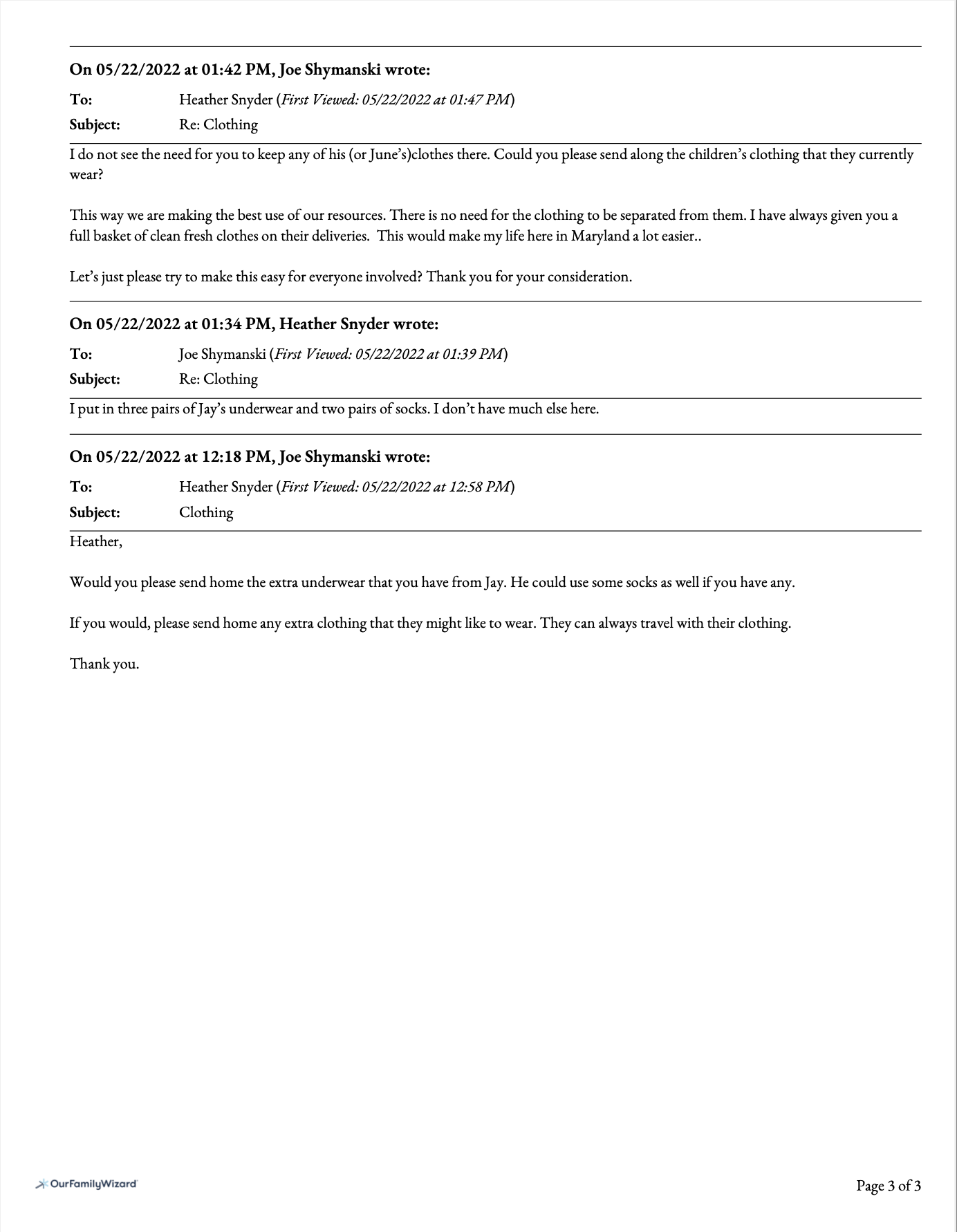 Joe would accuse me of keeping the kids’ clothing. I stopped altogether using any of the clothes he sent with them, I didn’t even touch the bag. I supplied the kids with plenty of clothes and I sent them back to Joe in the clothes they came in. I even ordered them new clothes and had them sent to his house. It did not matter.